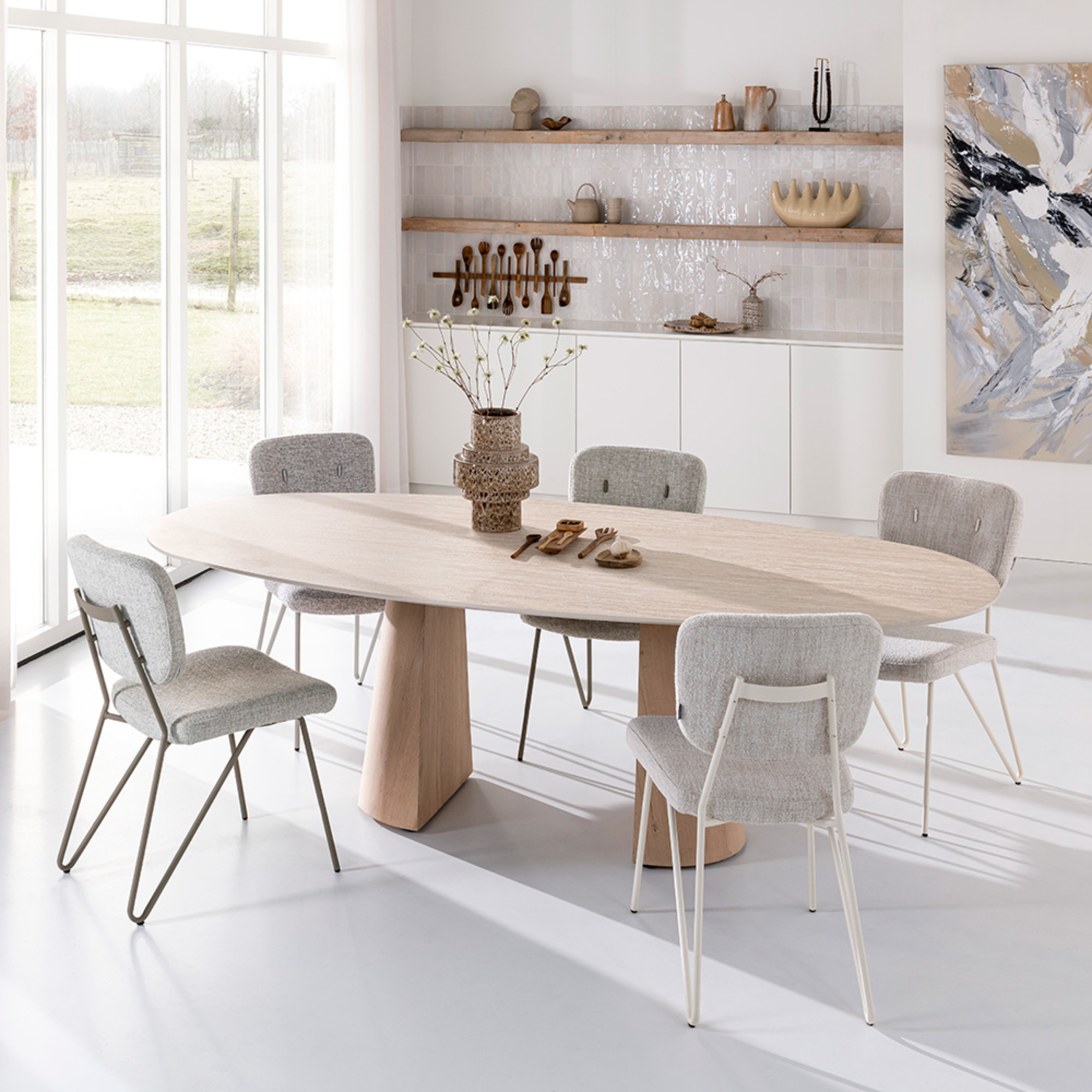 Gezellige diners, spelletjesavonden en lange gesprekken: in de herfst brengen we meer tijd door aan tafel. De Aras eettafel met ovale vorm en travertinlook is dé eyecatcher van het seizoen. De natuurlijke uitstraling en royale afmeting maken hem ideaal voor sfeervolle avonden met vrienden en familie.